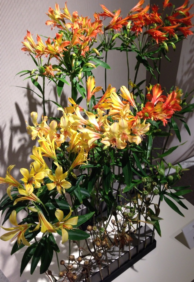 一応、午前中に自宅で一通りやってみて、うまく出来たので大丈夫と思っていたのですが、いざ会場でやり始めたら、どうしても花のバランスがとれず、試行錯誤することになりました。周りの出品者の方が手際よく設置して帰って行く中、何本か立たせてはドミノ倒しという状況を4、5回繰り返してしまい、気持ちがすごく焦って、テンパってしまい、先生に助けを求めました。結局、先生が花くばりの枝を追加してくれて、なんとか終わった時には22時を過ぎていました。